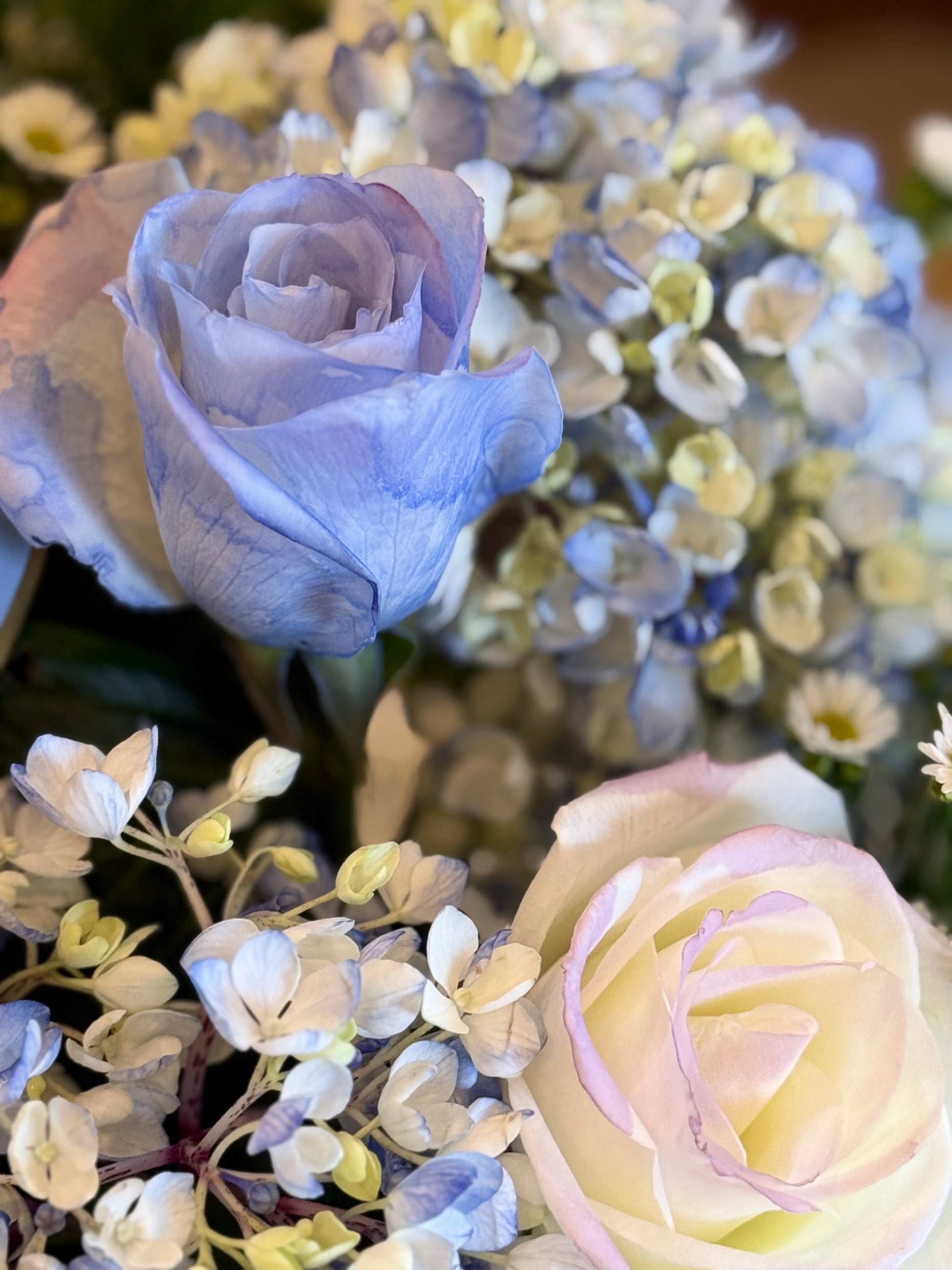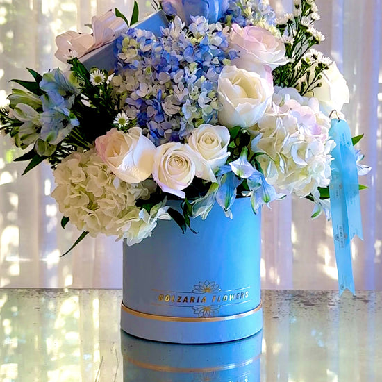 A graceful blend of pale blue hydrangeas, white roses, and soft blue lilies arranged in our signature powder-blue velvet hatbox. Topped with an elegant heart-shaped gift box and satin ribbon, this piece radiates calm, refinement, and timeless charm.